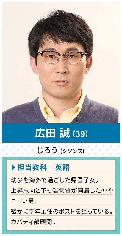 广田诚介绍:39岁,英语老师,卡巴迪部的顾问。归国子女,在海外度过了童年时代。向上的意愿比较低,但又是个很难相处的男人。秘密地觊觎着年级主任的宝座。